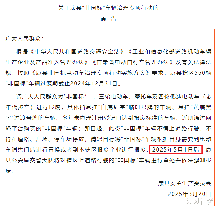 另外甘肃康县公安交警明确,从5月1日起,非国标二三轮电动车、摩托车、四轮低速电动车,需要进行报废处理,5月1日起继续违规上路,将会被查处并依法强制报废。