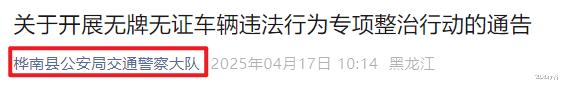 4月17日,黑龙江桦南县公安交警明确,将开展无牌无证车辆违法行为专项整治行动,本次整治行动结束时间到9月30日。