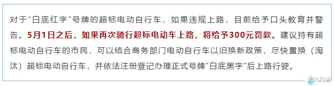 另外,湖北大治市交警明确,从5月1日起,原来悬挂“白底红字”号牌的非标电动车,不允许继续上路行驶,如果违规上路被交警查处将会给予300元罚款处罚。